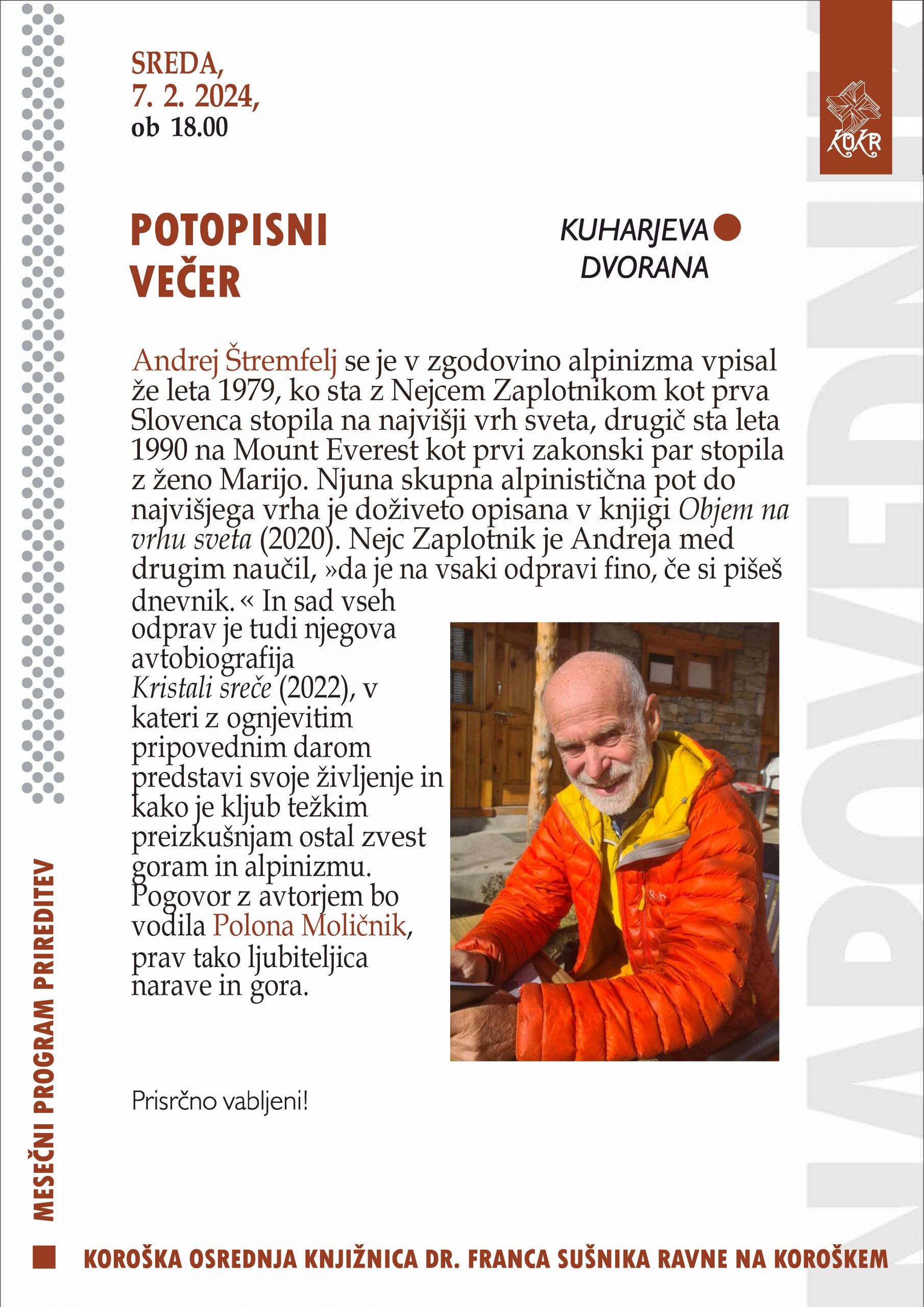 Andrej Štremfelj se je v zgodovino alpinizma vpisal že leta 1979, ko sta z Nejcem Zaplotnikom kot prva Slovenca stopila na najvišji vrh sveta, drugič sta leta 1990 na Mount Everest kot prvi zakonski par stopila z ženo Marijo. Njuna skupna alpinistična pot do najvišjega vrha je doživeto opisana v knjigi Objem na vrhu sveta (2020). Nejc Zaplotnik je Andreja med drugim naučil, »da je na vsaki odpravi fino, če si pišeš dnevnik.« In sad vseh odprav je tudi njegova avtobiografija Kristali sreče (2022), v kateri z ognjevitim pripovednim darom predstavi svoje življenje in kako je kljub težkih preizkušnjam ostal zvest goram in alpinizmu. Pogovor z avtorjem bo vodila Polona Moličnik, prav tako ljubiteljica narave in gora.