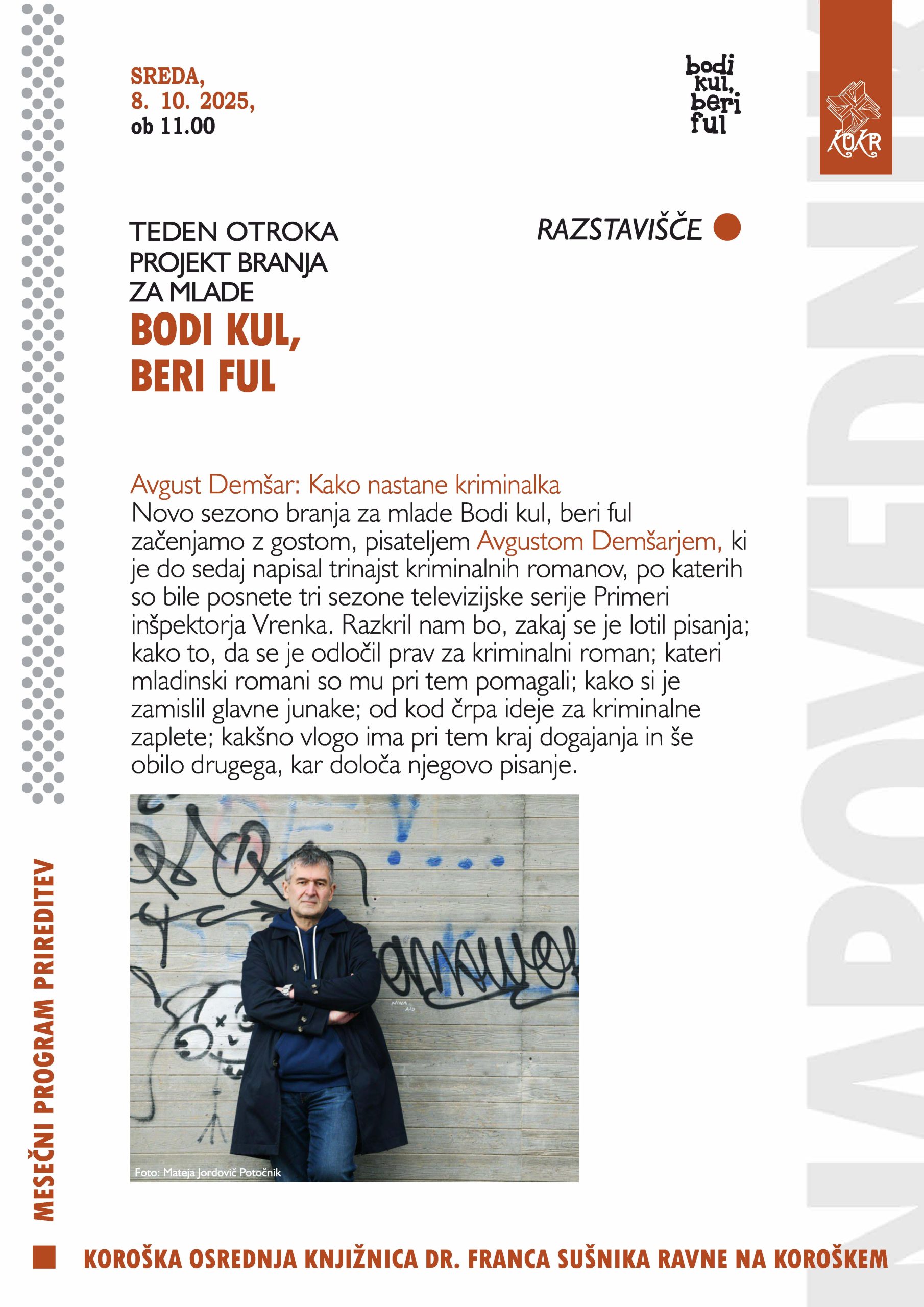 Novo sezono branja za mlade Bodi kul, beri ful začenjamo z gostom, pisateljem Avgustom Demšarjem, ki je do sedaj napisal trinajst kriminalnih romanov, po katerih so bile posnete tri sezone televizijske serije Primeri inšpektorja Vrenka. Razkril nam bo, zakaj se je lotil pisanja; kako to, da se je odločil prav za kriminalni roman; kateri mladinski romani so mu pri tem pomagali; kako si je zamislil glavne junake; od kod črpa ideje za kriminalne zaplete; kakšno vlogo ima pri tem kraj dogajanja in še obilo drugega, kar določa njegovo pisanje.