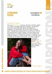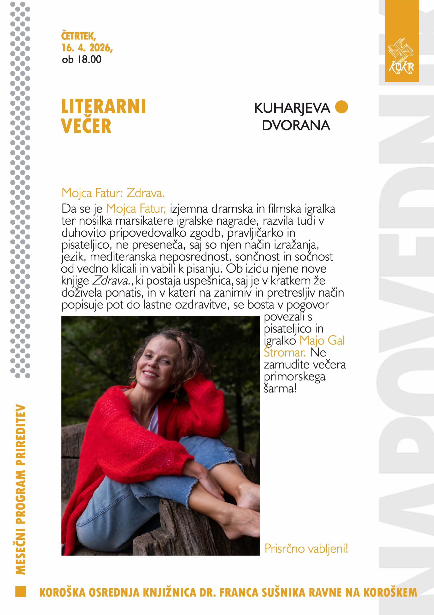 Da se je Mojca Fatur, izjemna dramska in filmska igralka ter nosilka marsikatere igralske nagrade, razvila tudi v duhovito pripovedovalko zgodb, pravljičarko in pisateljico, ne preseneča, saj so njen način izražanja, jezik, mediteranska neposrednost, sončnost in sočnost od vedno klicali in vabili k pisanju. Ob izidu njene nove knjige Zdrava., ki postaja uspešnica, saj je v kratkem že doživela ponatis, in v kateri na zanimiv in pretresljiv način popisuje pot do lastne ozdravitve, se bosta v pogovor povezali s pisateljico in igralko Majo Gal Štromar. Ne zamudite večera primorskega šarma!