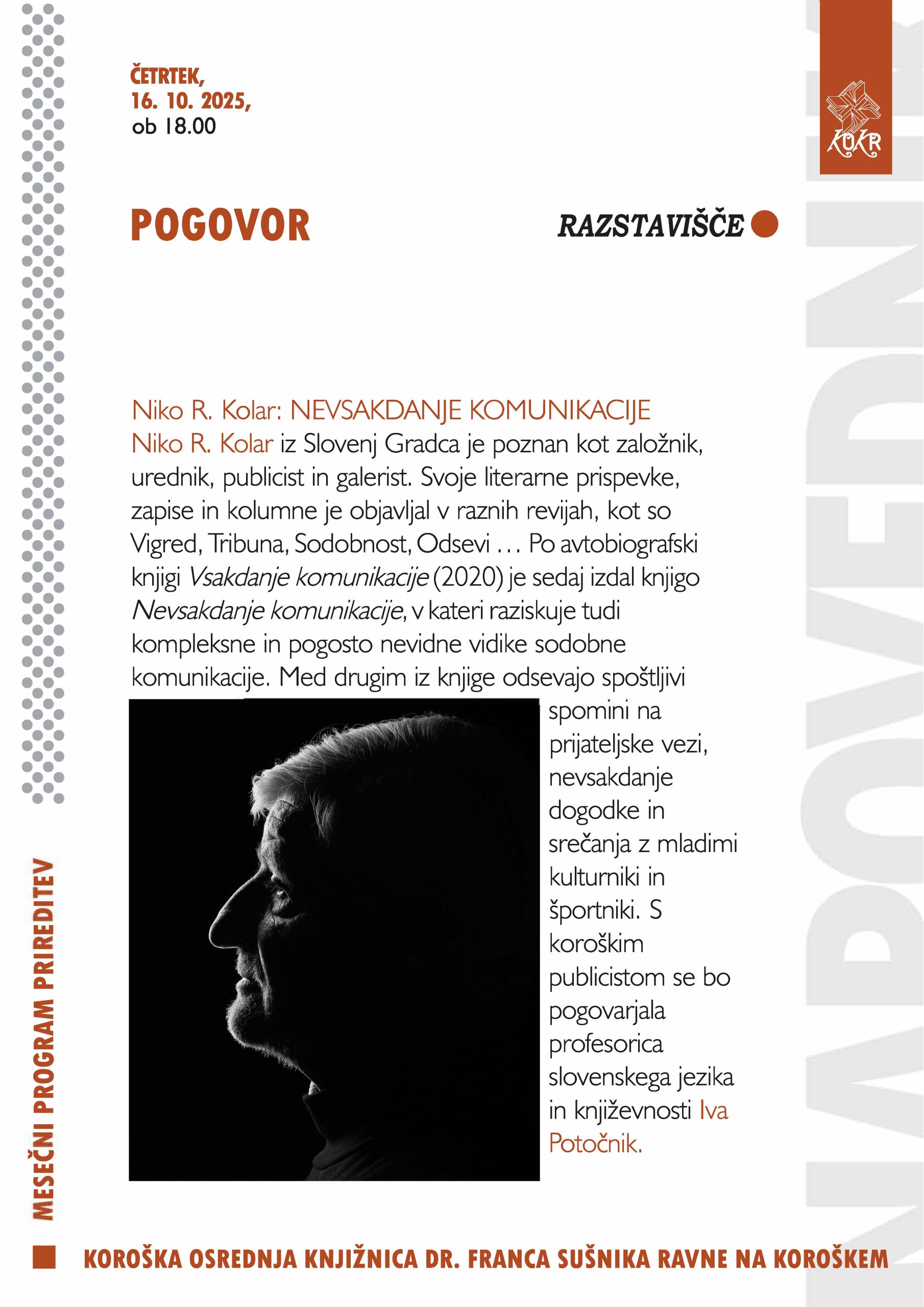 Niko R. Kolar iz Slovenj Gradca je poznan kot založnik, urednik, publicist in galerist. Svoje literarne prispevke, zapise in kolumne je objavljal v raznih revijah, kot so Vigred, Tribuna, Sodobnost, Odsevi … Po avtobiografski knjigi Vsakdanje komunikacije (2020) je sedaj izdal knjigo Nevsakdanje komunikacije, v kateri raziskuje tudi kompleksne in pogosto nevidne vidike sodobne komunikacije. Med drugim iz knjige odsevajo spoštljivi spomini na prijateljske vezi, nevsakdanje dogodke in srečanja z mladimi kulturniki in športniki. S koroškim publicistom se bo pogovarjala profesorica slovenskega jezika in književnosti Iva Potočnik.